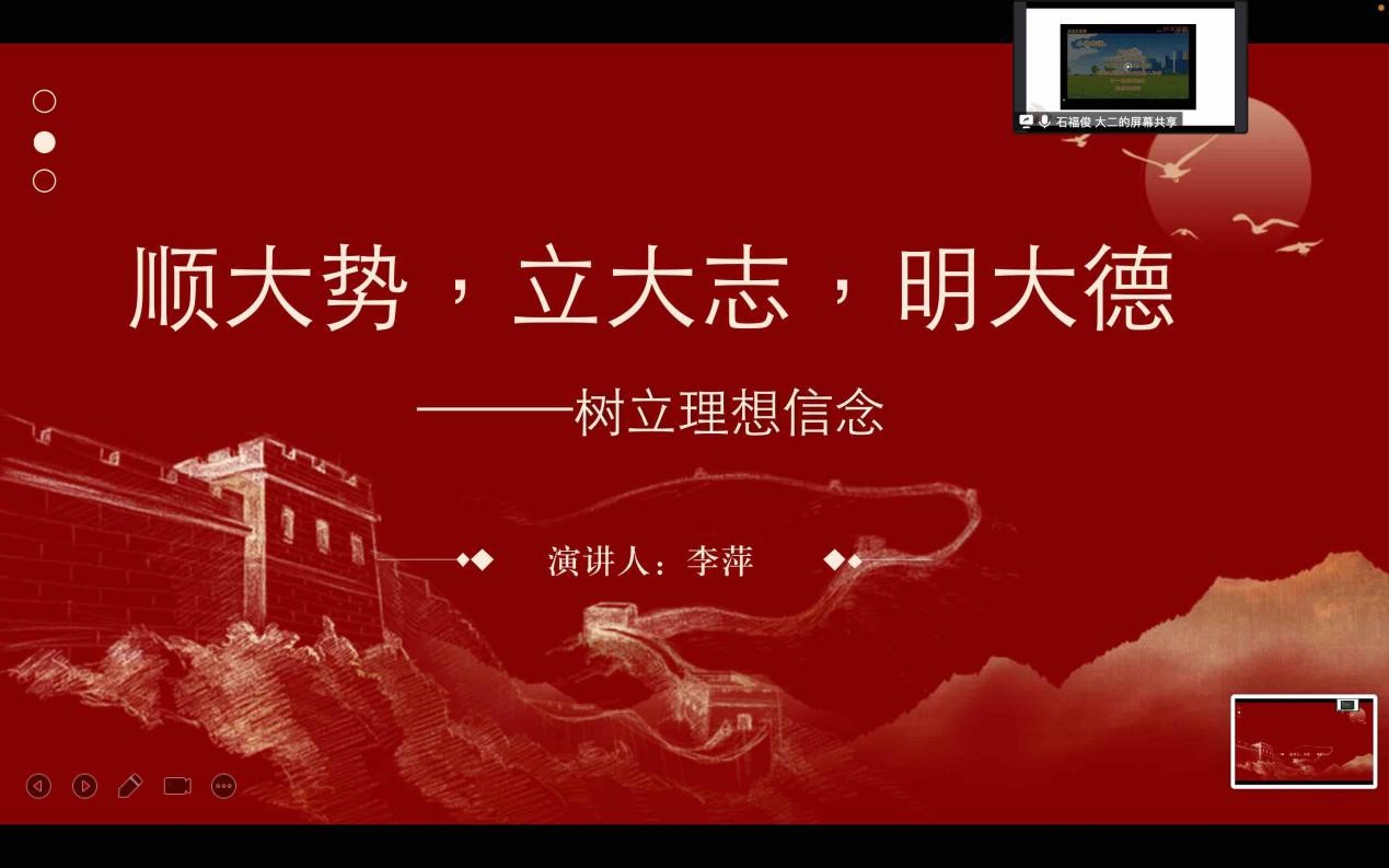 主题教育班会是大学生班级教育活动的主要形式之一,更是班风塑造、学风形成的重要抓手,是思政育人主阵地。为发挥主题班会思政教育主渠道作用,提升育人实效,我校学工处在寒假期间组织大一至大四四个年级组对2023年春季学期主题教育班会课程进行制作、打磨。2月7—8日,学工处组织开展主题班会线上演练试讲活动,校党委副书记唐新强出席活动,学工处处长邓良峰、时尚传媒学院党总支副书记黄朝辉及参与制作的辅导员参加了此次活动。
