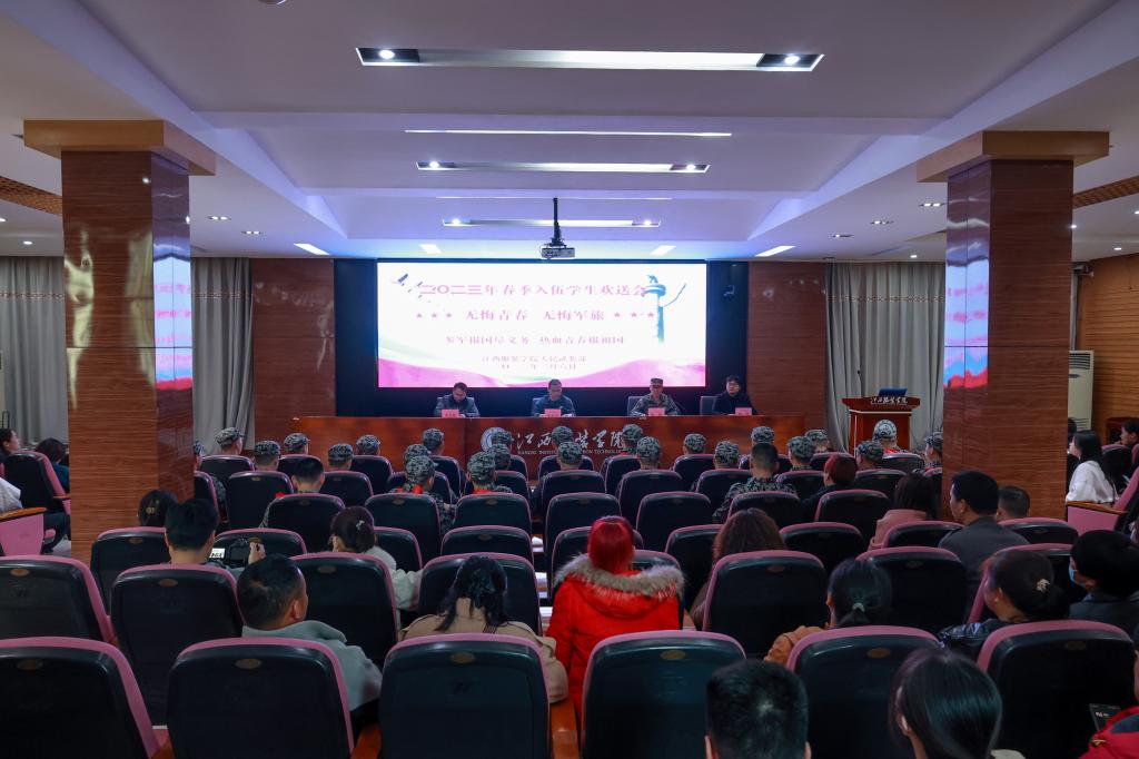 阳春三月,扬帆起航,3月6日早晨,我校在行政楼一楼报告厅举行2023年春季大学生入伍欢送会。校党委副书记唐新强,学生工作部(处)长邓良峰,人民武装部部长鲍鹏、部副科长胡康、学院负责征兵工作辅导员、2023年春季入伍学生及家长、部分学生代表共计100余人参加会议。