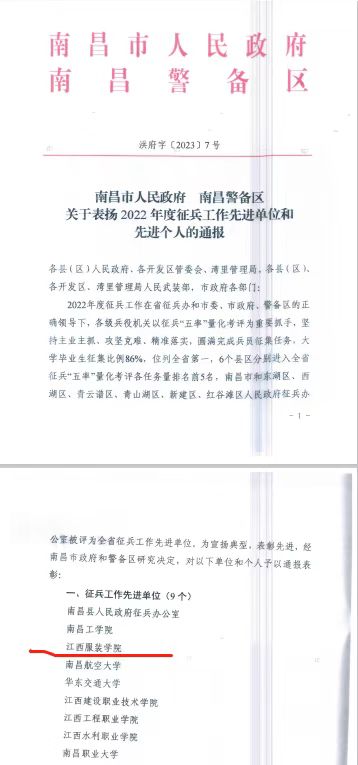 近日,南昌市人民政府、南昌警备区印发了《关于表扬2022年度征兵工作先进单位和先进个人的通报》(洪府字[2023]7号)。我校因征兵工作成绩突出、任务完成较好,受到通报表彰,并荣获“2022年度征兵工作先进单位”荣誉称号。