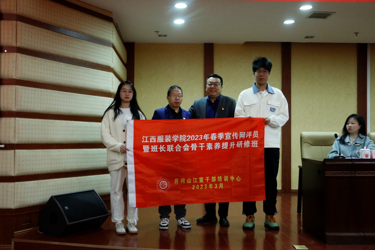 3月10日上午八点半,研修班在多功能厅进行了开班仪式。井冈山江宣干部培训中心主任欧阳志荣代表培训中心对全体学员的到来表示了欢迎,并希望学员们不仅可以在此次井冈之行中有所成长和收获,更要将井冈山精神带回去影响身边更多的人。江西服装学院学工处思政教育科副科长刘检莲代表江服的全体学员对培训中心工作人员表示诚挚的感谢,并就本次的学习活动对大家提出了几点意见,希望大家珍惜这次机会,使这次培训真正成为一次有感悟、有提高,净化心灵、提升灵魂的深度学习。开班仪式最后,培训中心主任欧阳志荣和江西服装学院党委宣传部副部长朱雨春共同为本次培训班授班旗。